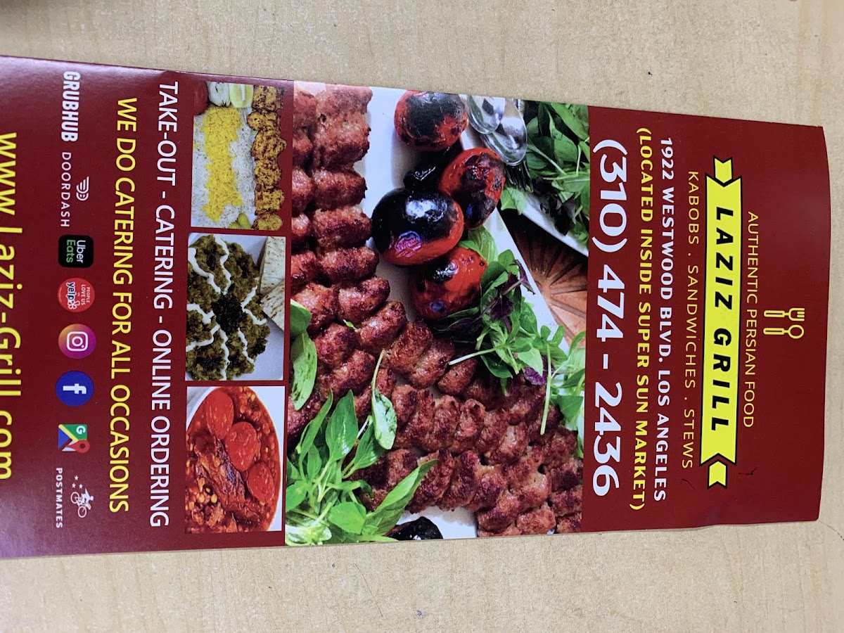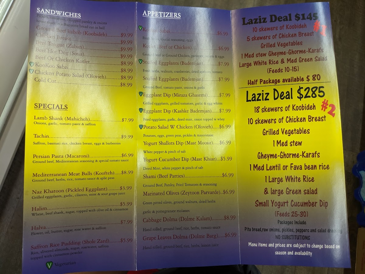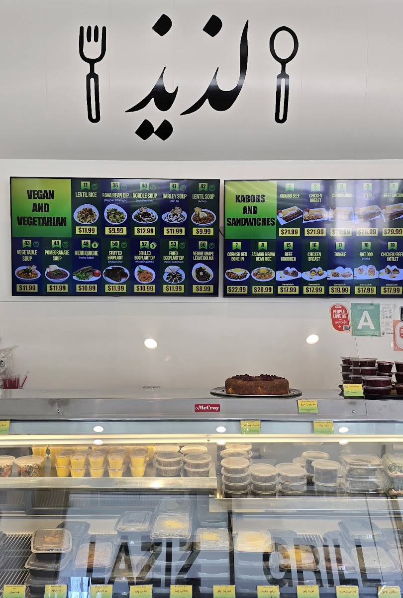 The menu at Laziz Grill offers a vibrant mix of traditional Persian flavors, with a focus on fresh ingredients and bold seasonings. Among the standout dishes, the Kabob Torsh shines with its tangy, grilled perfection, while the hearty Ghormeh Sabzi provides a rich and savory herb-based stew that is a favorite for many. For those seeking a light yet flavorful side, the Fava Beans make a great choice, offering a refreshing contrast to the heavier mains. The Satay is another must-try, bringing a smoky, grilled flavor that's both satisfying and tender. To start off the meal, the Barley Soup Ash Jo offers a warming, comforting experience with a mix of grains and vegetables, making it an ideal appetizer. The Ground Beef and Rice Inside is a unique take on stuffed rice, full of savory goodness that pairs perfectly with a side of fresh Eggplant Salad. If you’re craving something more substantial, the Koofteh Persian Meat Balls are a great option, packed with flavor and a bit of a spice kick. For a delightful combination of textures, the Pilaf brings a fluffy, aromatic side that complements the meal beautifully. Lastly, the Wrap is a convenient, portable choice for those on the go, packed with savory ingredients wrapped in soft, warm bread. With so many delicious options, Laziz Grill’s menu offers something for everyone, from comforting stews to vibrant sides and succulent grilled items.